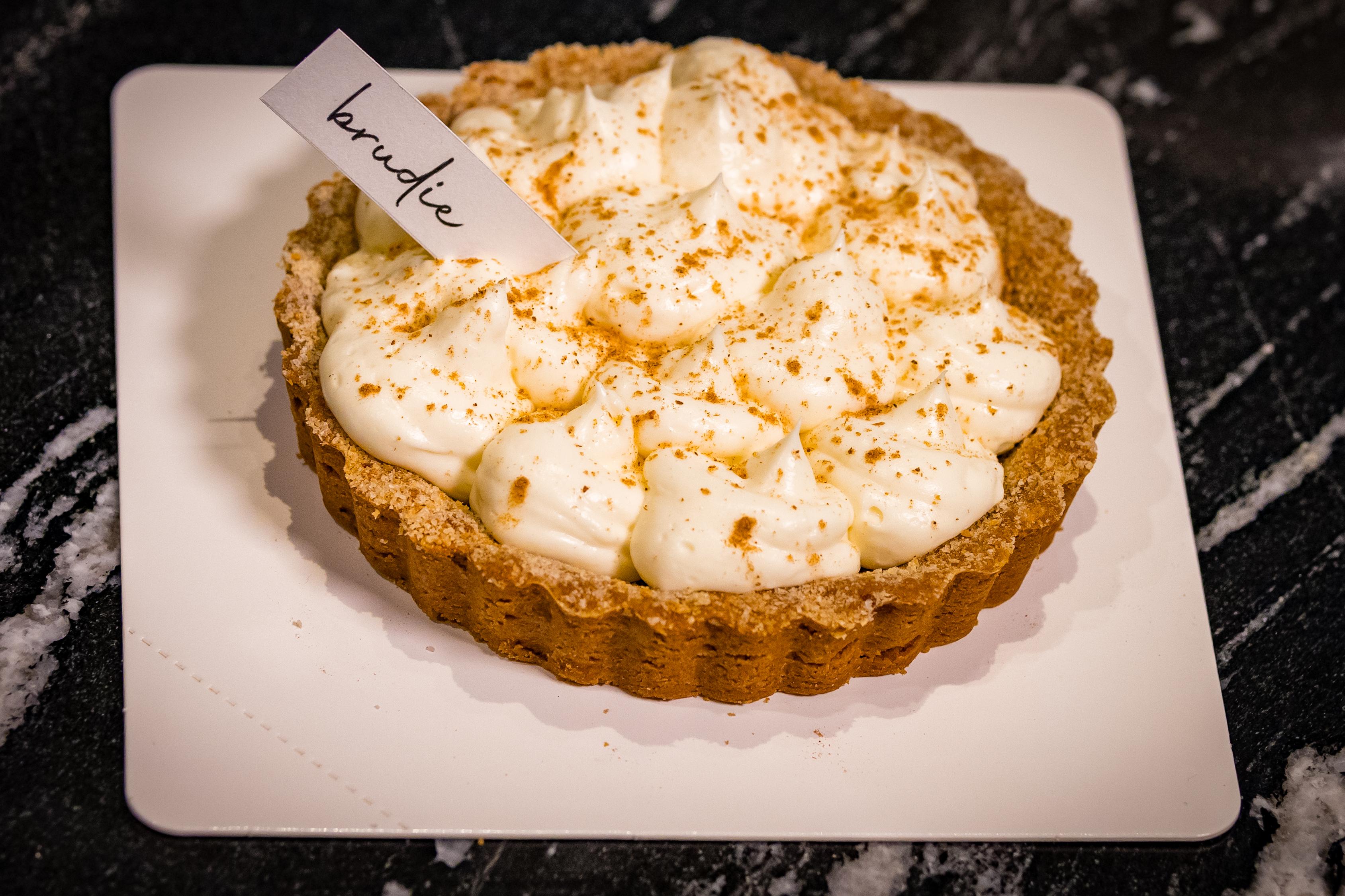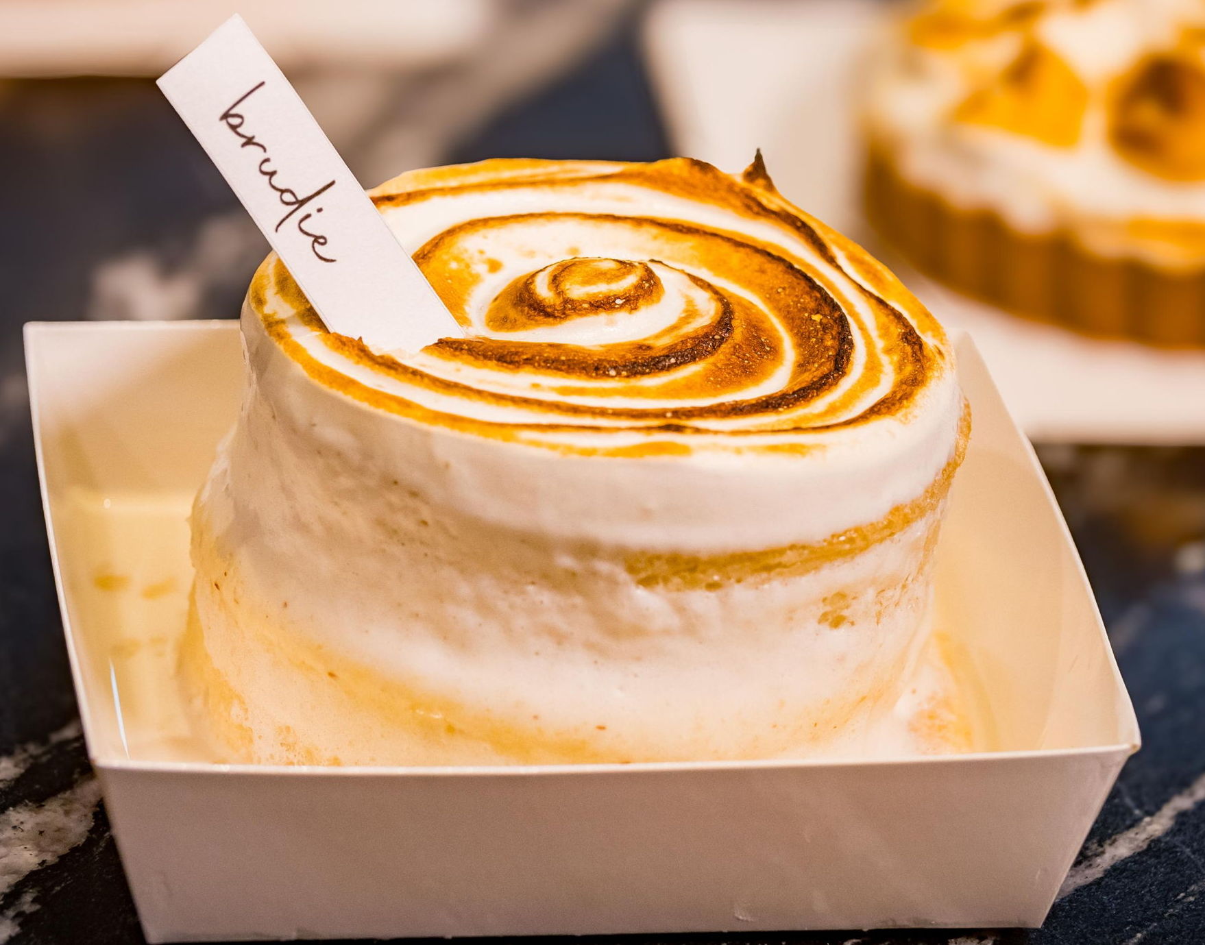 Deliciosa crema de limón montada en galleta horneada con mantequilla y coronada con merengue